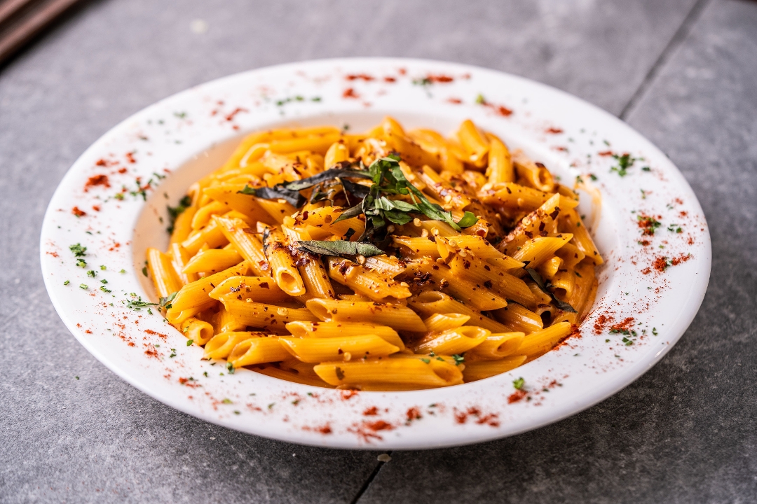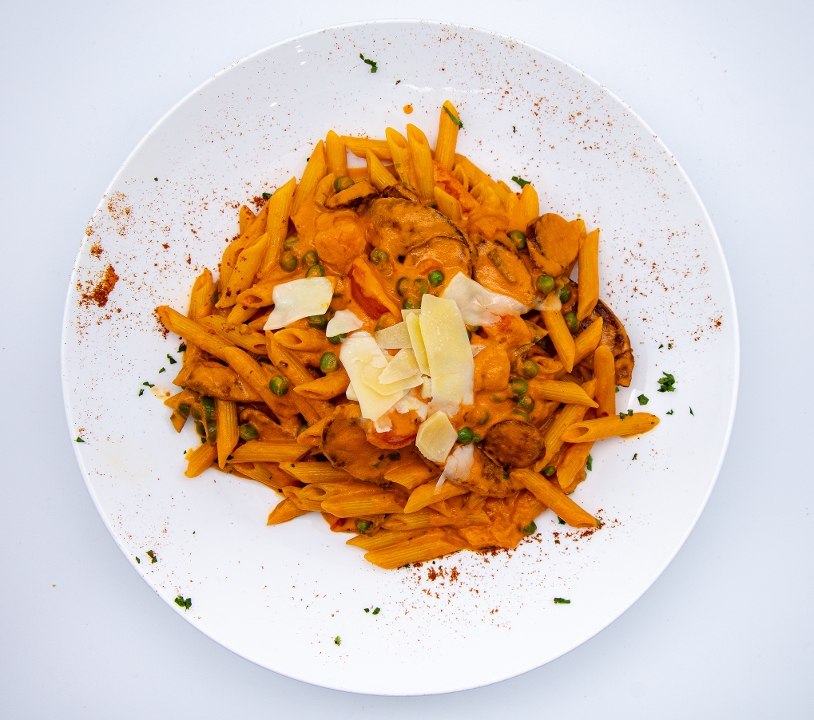 Penne, sausage, Italian long hot peppers, peas, and a pink cream sauce