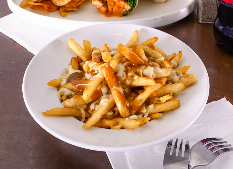 French fries with melted mozzarella cheese, melted American cheese, bacon, and gravy