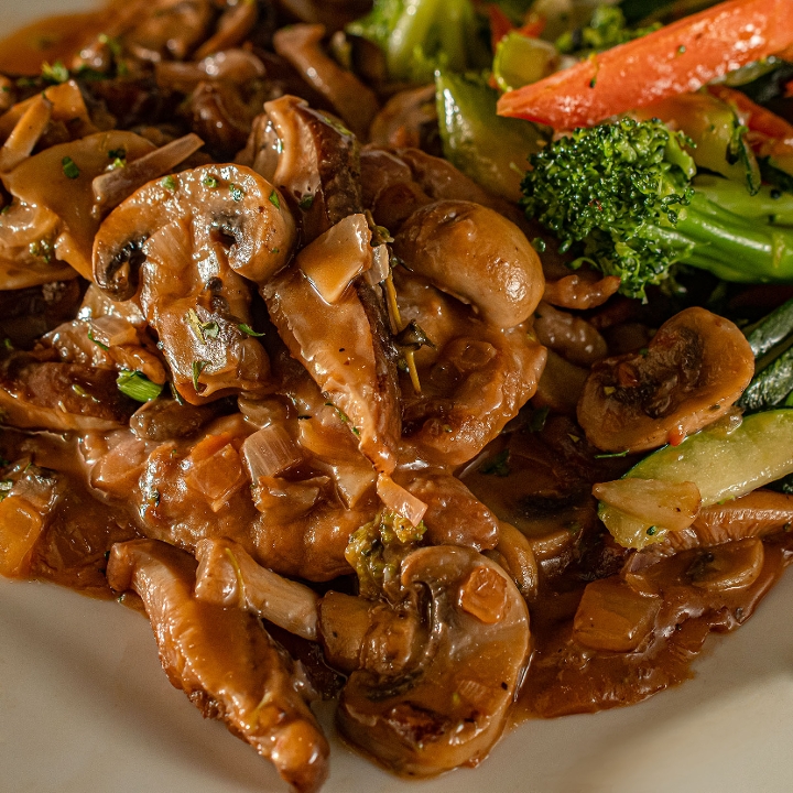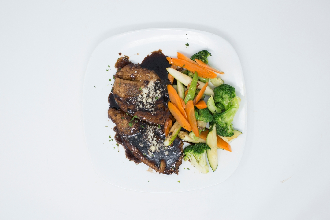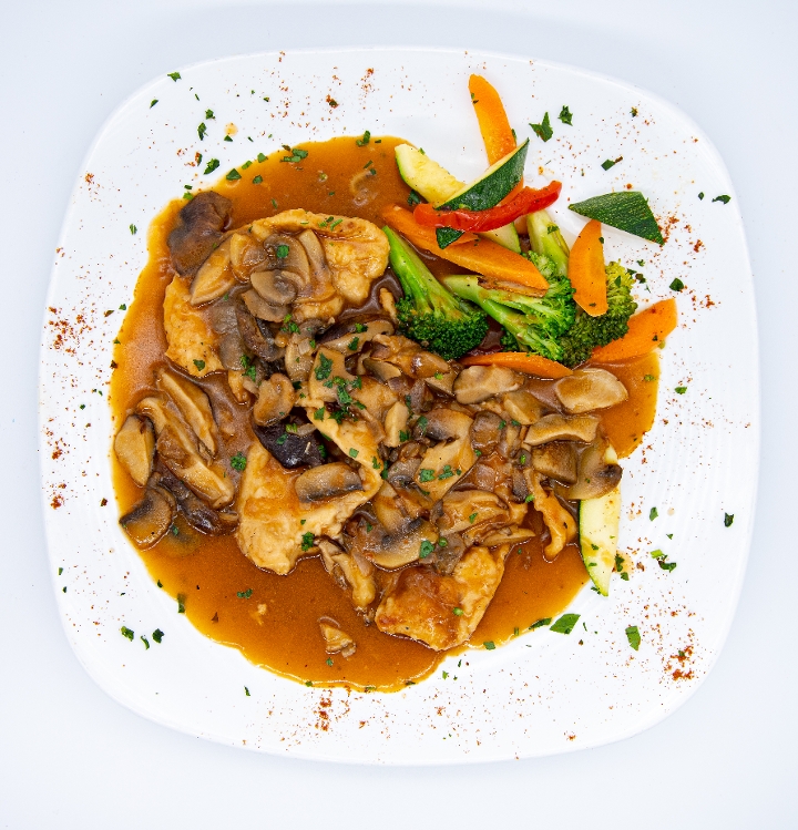 Balsamic vinegar sauce, topped with Romano cheese, served with sautéed vegetables