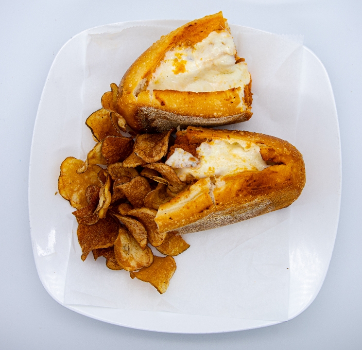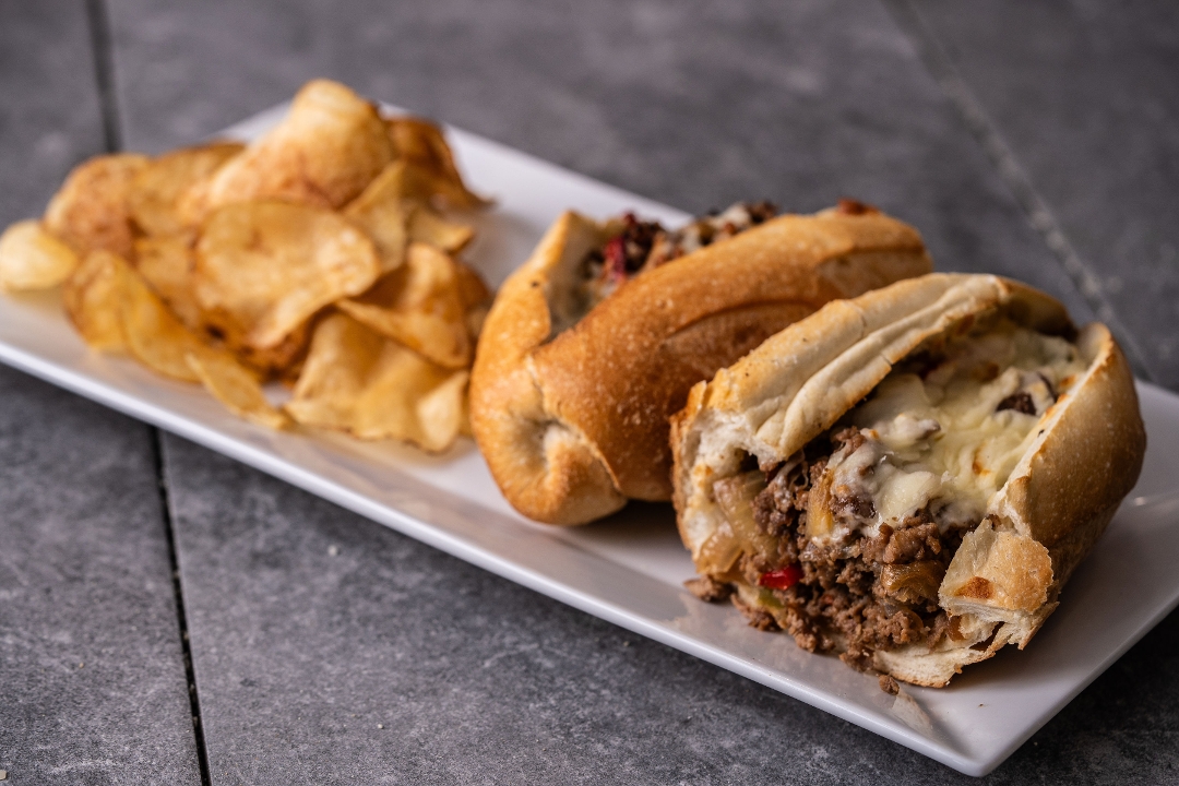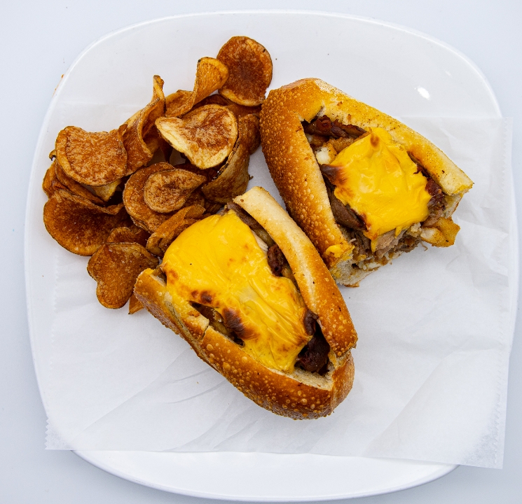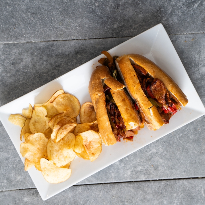Chicken Cheesesteak, onions, peppers, and Cooper sharp white american cheese