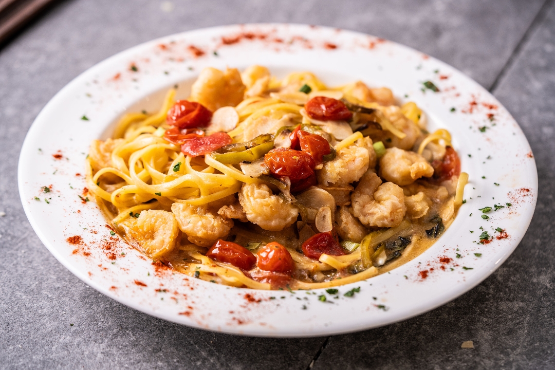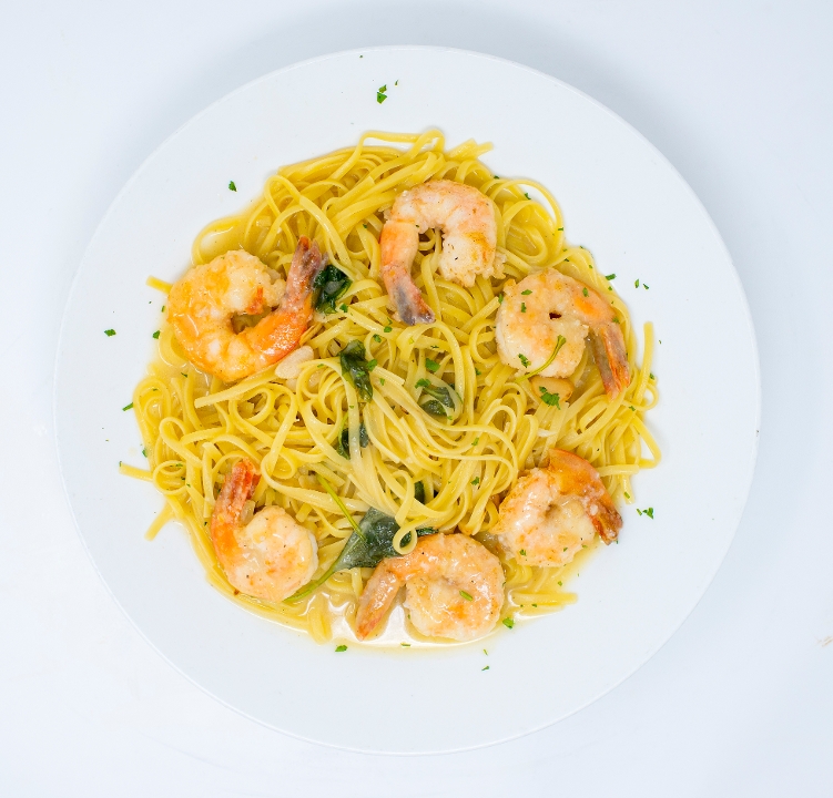 With rock shrimp, cherry tomatoes, baby spinach in a garlic white wine sauce