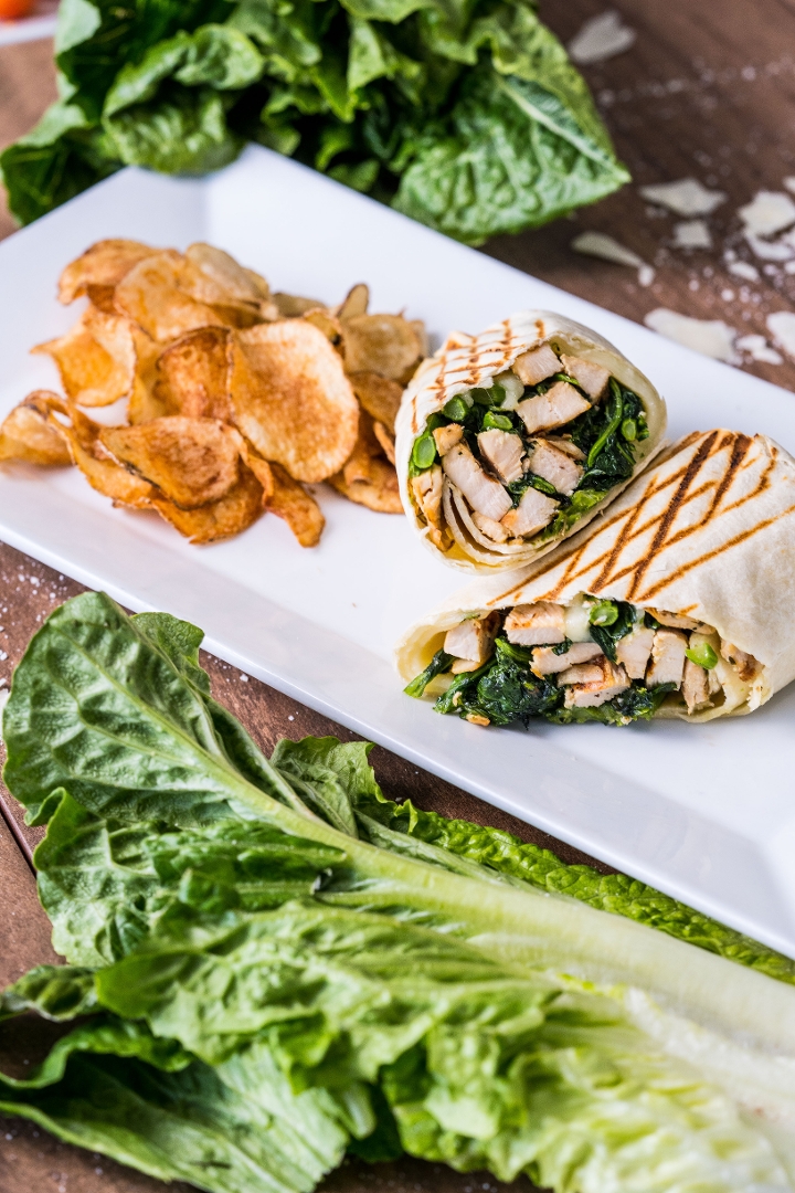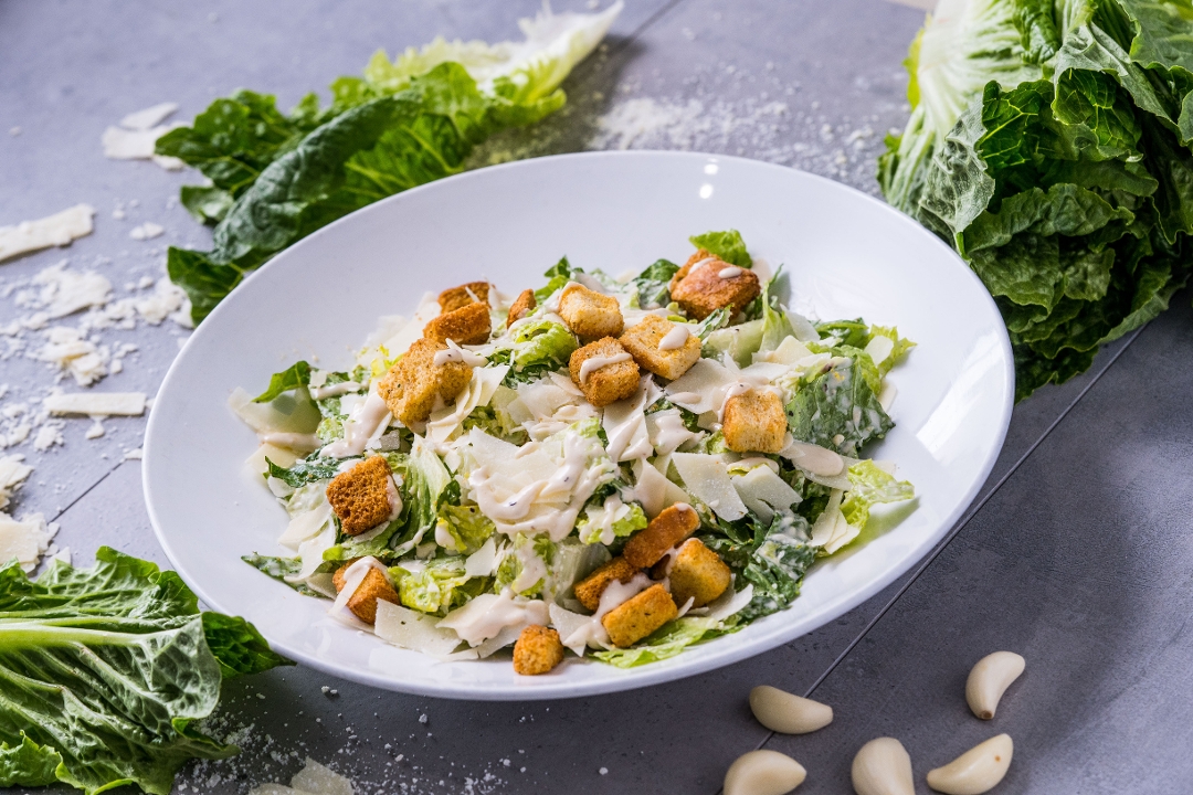 Grilled chicken, Caesar salad, croutons, shaved Parmesan, and grated Parmesan