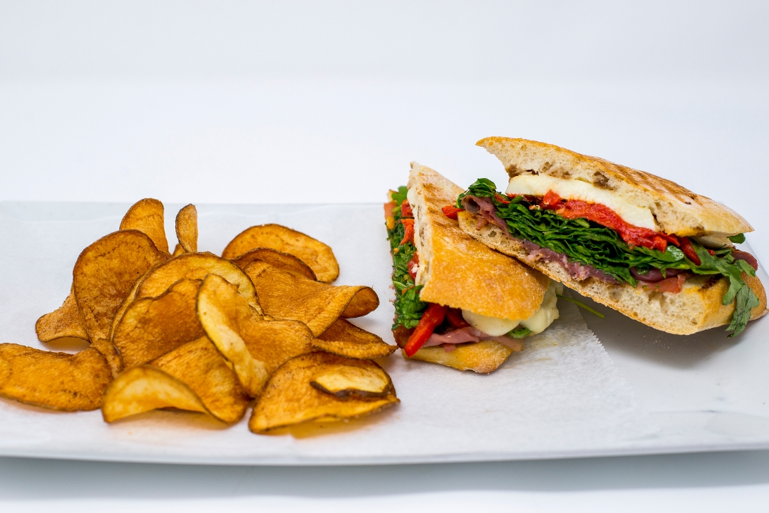 Fresh mozzarella, prosciutto, roasted peppers, arugula, tomatoes, and balsamic vinaigrette