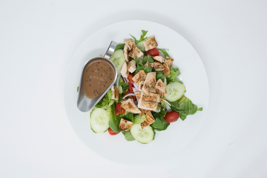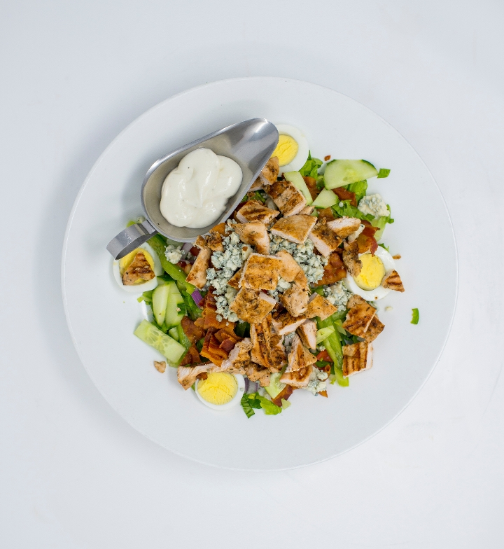 Grilled chicken, bacon, bell peppers, bleu cheese crumbles, cucumbers, hard boiled eggs, red onions, mixed greens, and tomato. Served with balsamic Vinaigrette