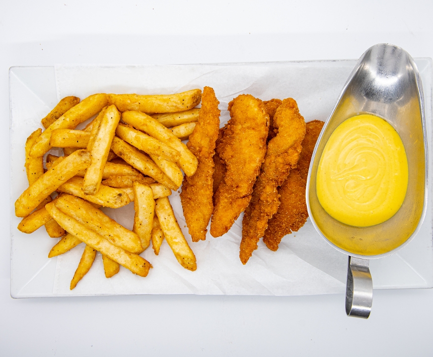 Mozzarella sticks, cheesesteak, chicken fingers, french fries, and honey mustard