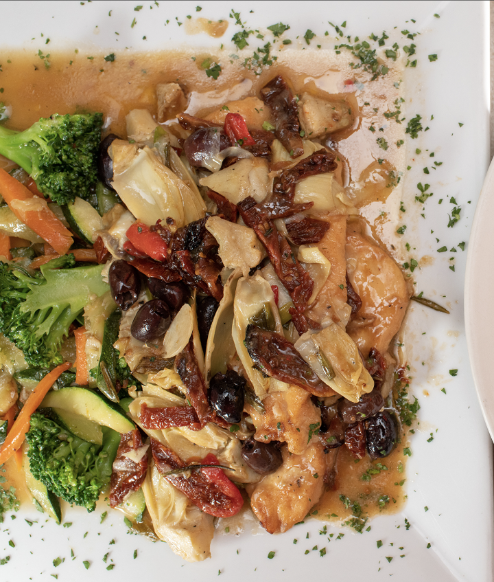Sun-dried tomatoes, artichoke hearts, olives, roasted peppers, white wine sauce, and sautéed vegetables