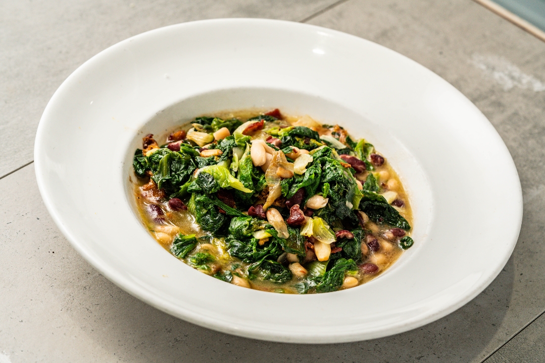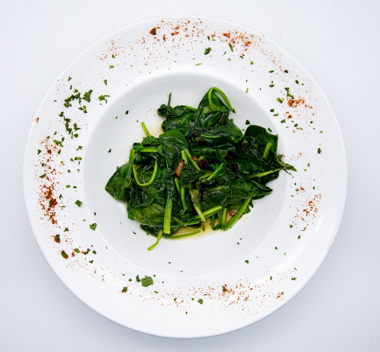 Olives, capers, diced tomatoes and white wine, served with sautéed spinach