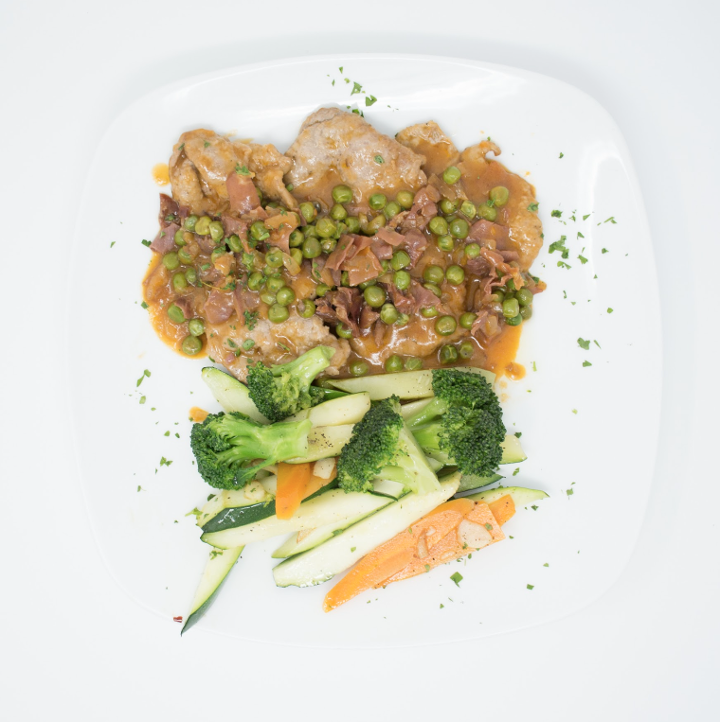 Prosciutto, peas, and onions, in a sherry wine sauce, with sautéed vegetables