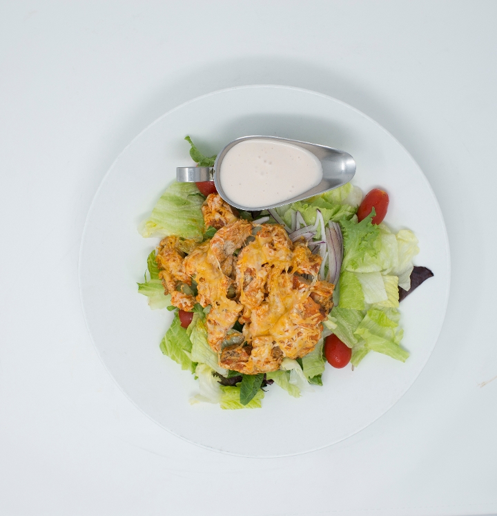 Breaded chicken tossed with buffalo sauce topped with melted cheddar cheese, over mixed greens, tomatoes, red onion, and bleu cheese vinaigrette