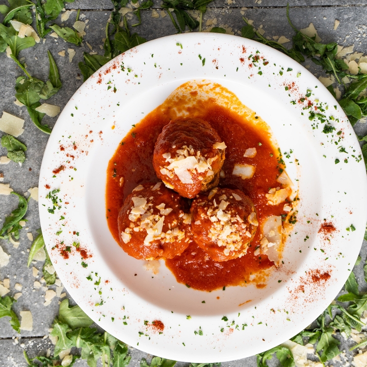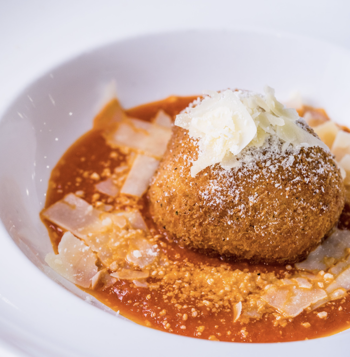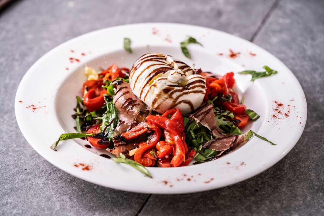 Burrata over arugula, cherry tomatoes, roasted red peppers and prosciutto. Topped with extra virgin olive oil and balsamic glaze