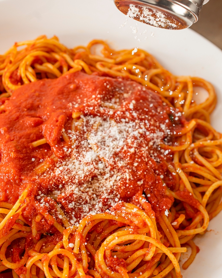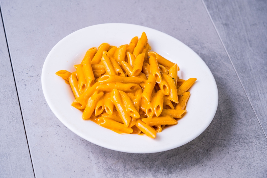 Spaghetti, tomato cream sauce, carrots, broccoli, zucchini, and peas