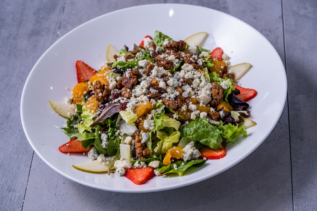 Mixed greens with glazed walnuts, pears, cranberries, strawberries, mandarin oranges, crumbled blue cheese, and raspberry vinaigrette.