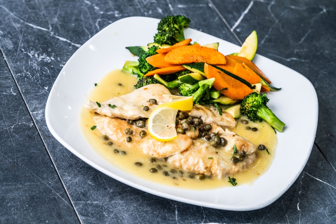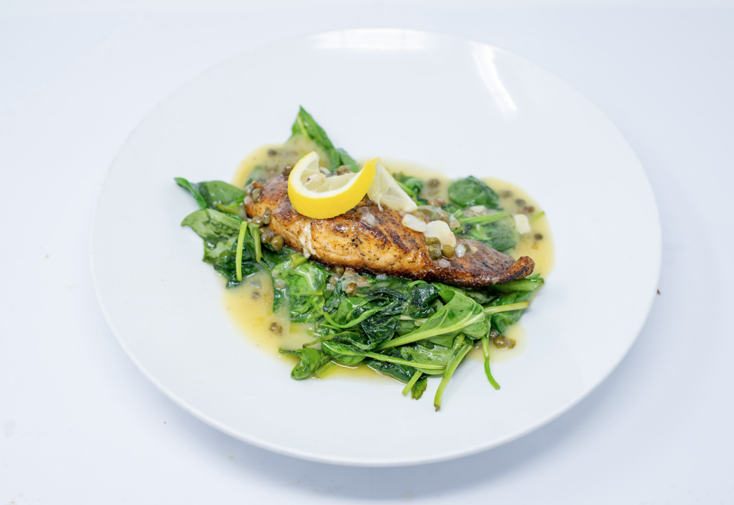 Capers, Lemon White Wine Sauce, served over Sauteed Spinach & Vegetables