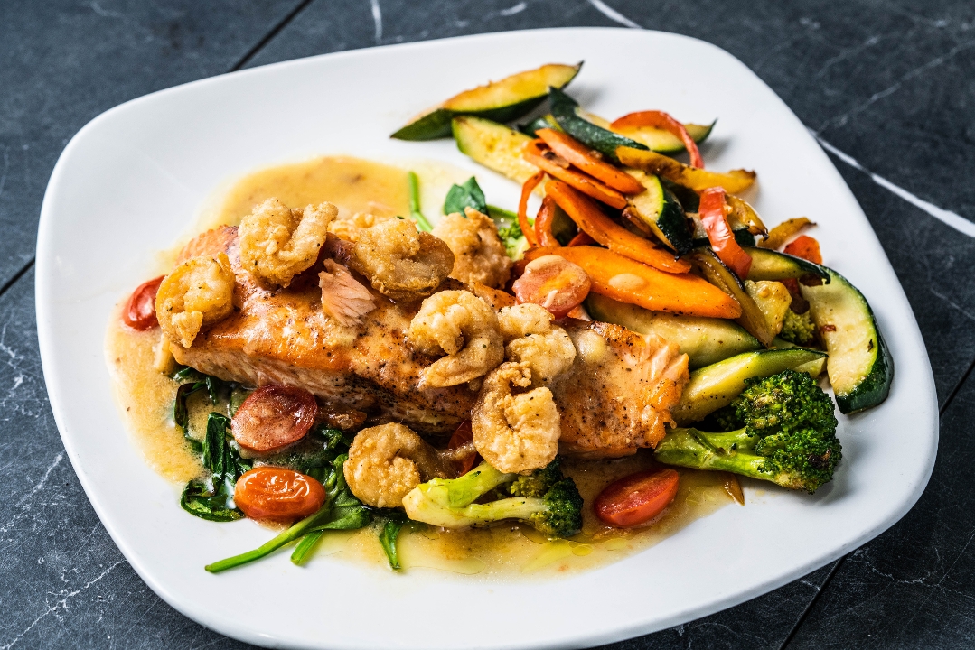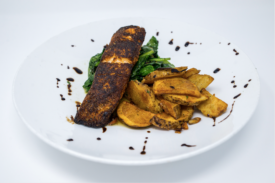 Fresh Atlantic Salmon served over sauteed spinach and veggies