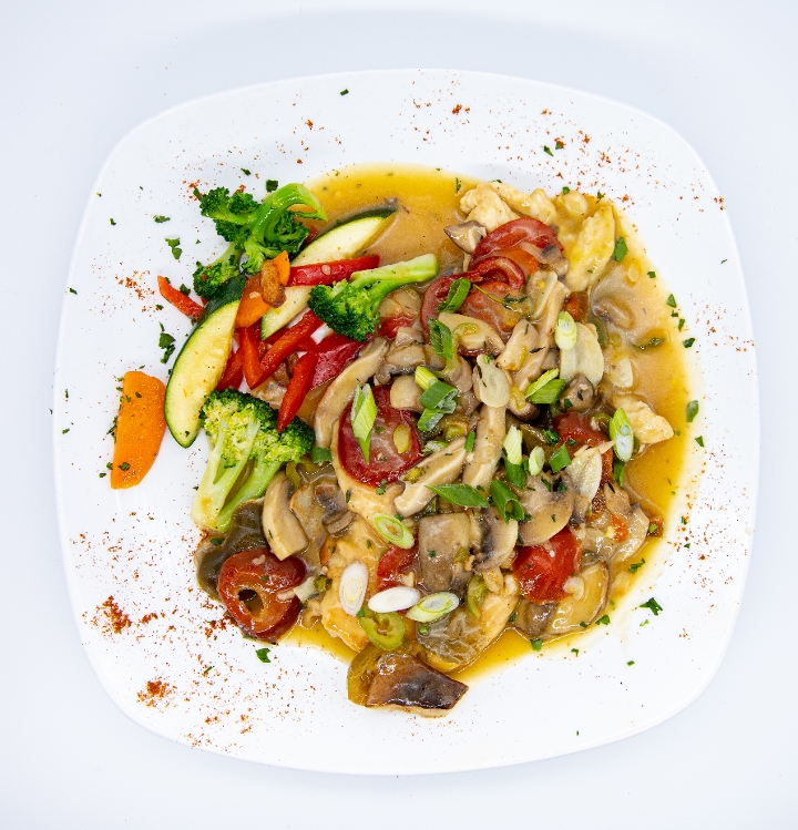 Sun-dried tomatoes, artichoke hearts, olives, roasted peppers, roasted garlic, and white wine, served with sautéed vegetables