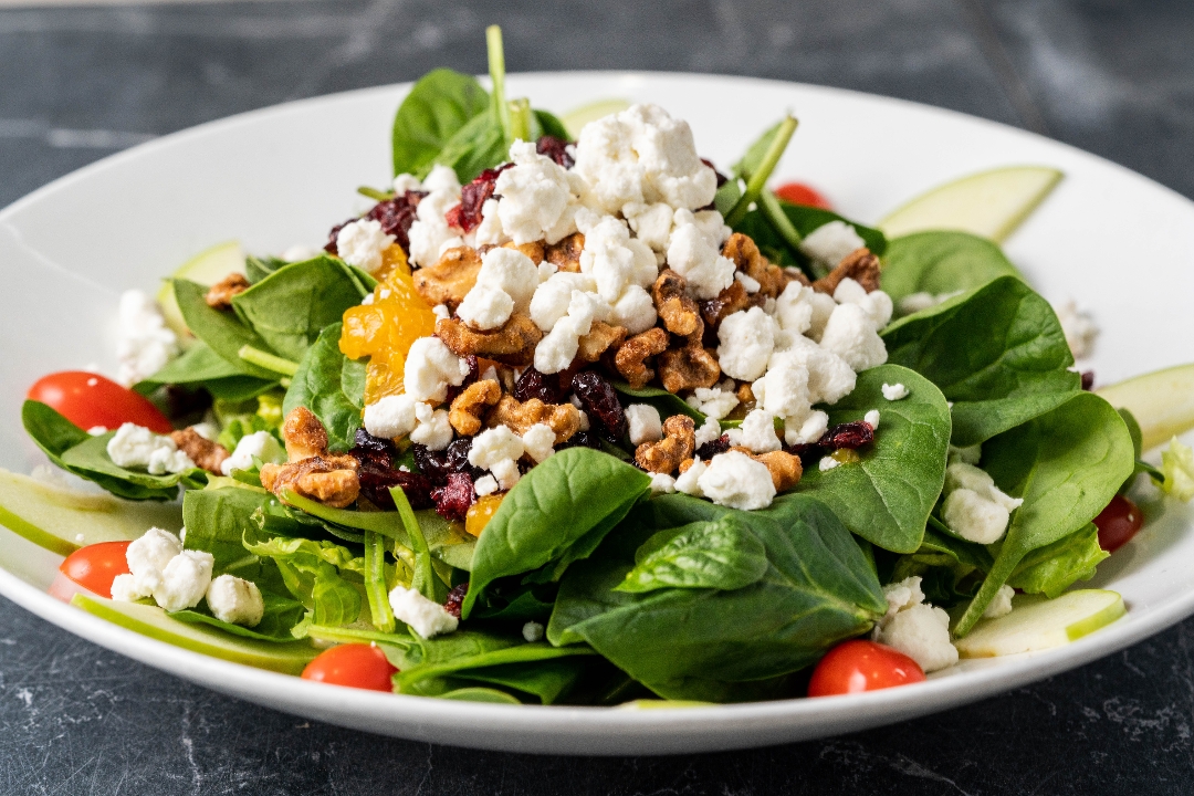 Spinach, romaine, glazed walnuts, mandarin orange, goat cheese, cherry tomatoes, cranberries, and granny smith apples. Served with balsamic vinaigrette