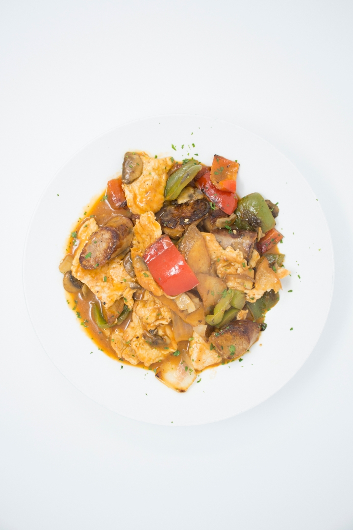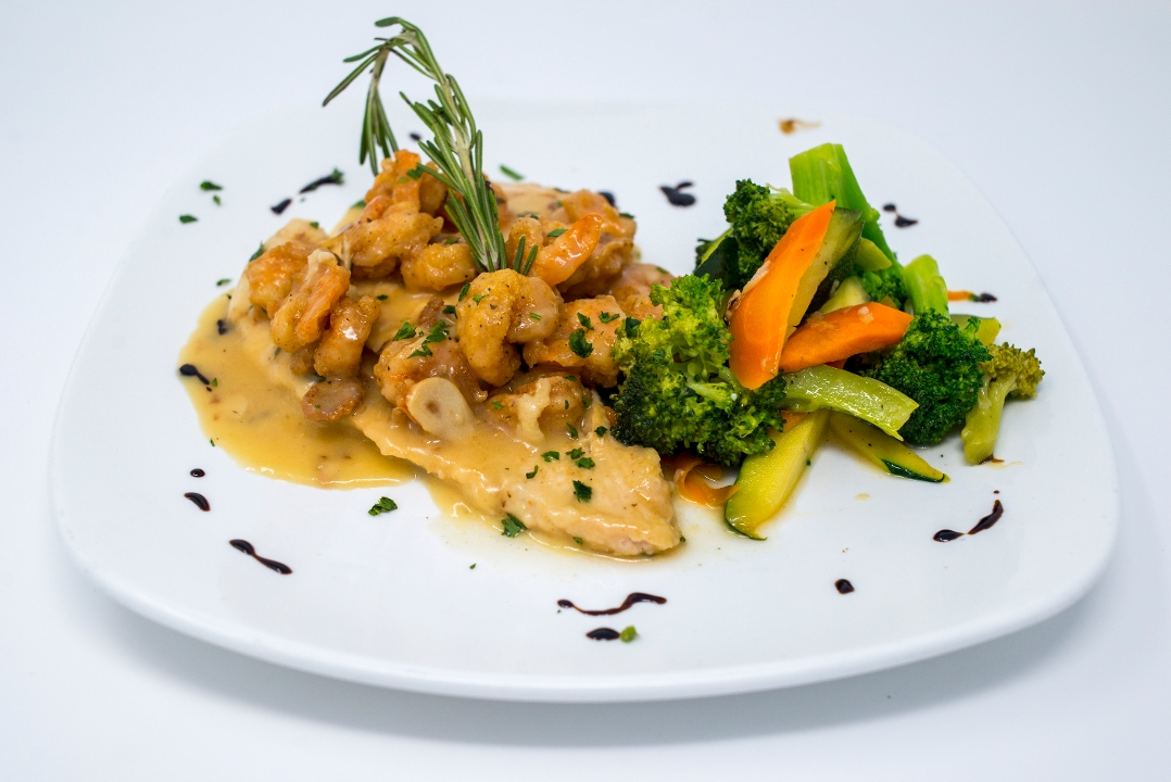 Chicken, rock shrimp, garlic white wine sauce, and sautéed vegetables