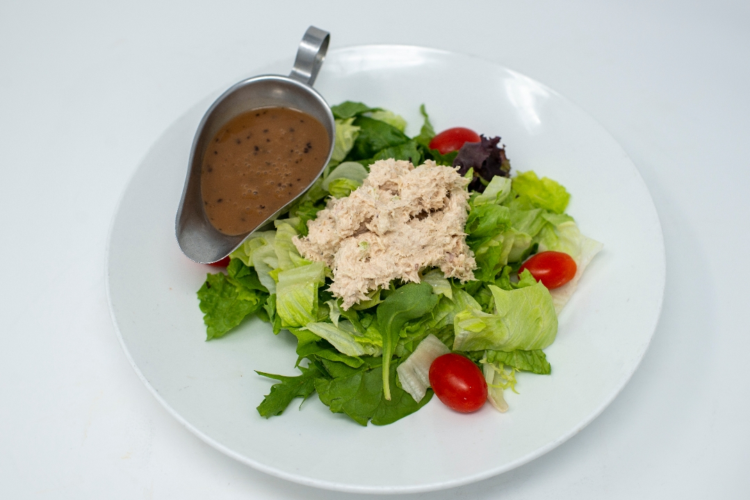 Solid white albacore tuna salad on a bed of mixed greens, tomato, red onion, and balsamic vinaigrette