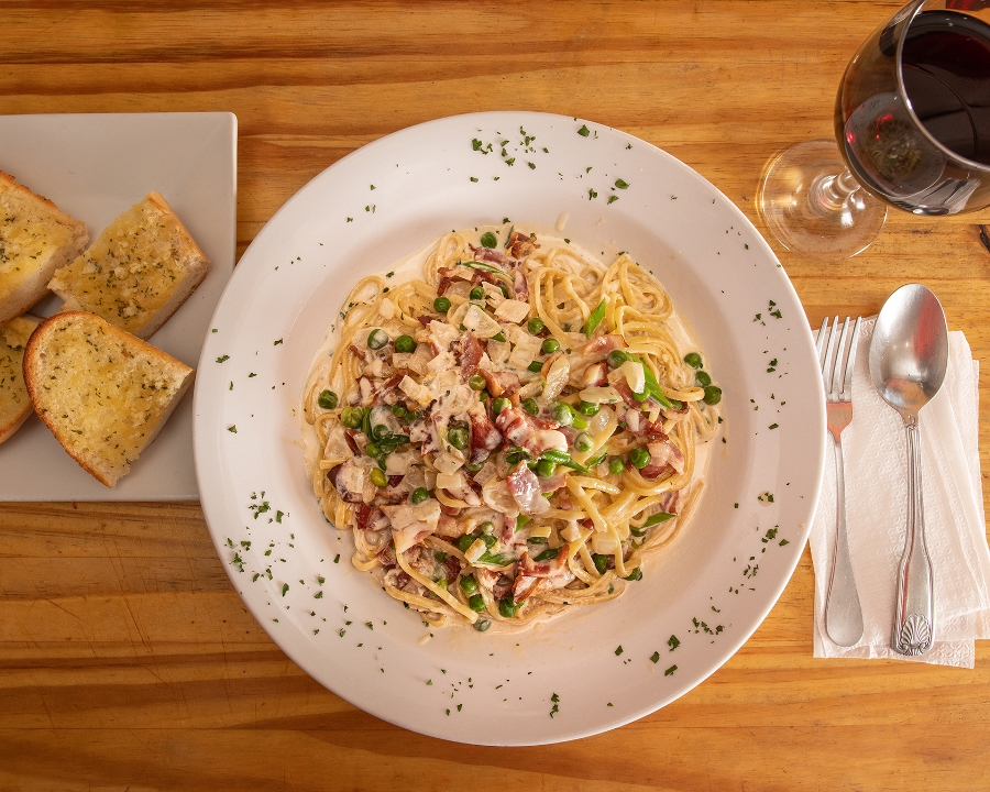 Linguine, onions, peas, bacon, eggs, cream, and Parmesan cheese