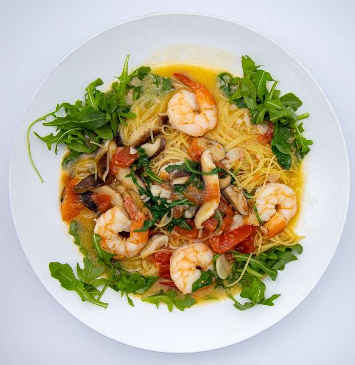 Capellini, shiitake mushrooms, shrimp, arugula, cherry tomatoes, and oil garlic sauce