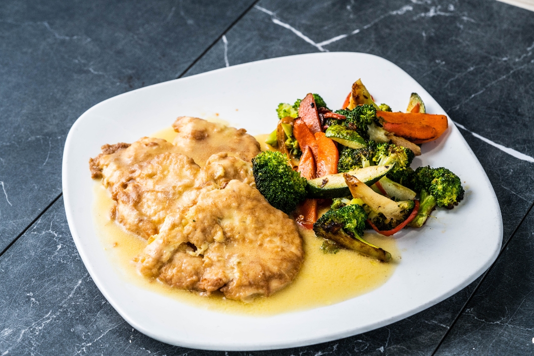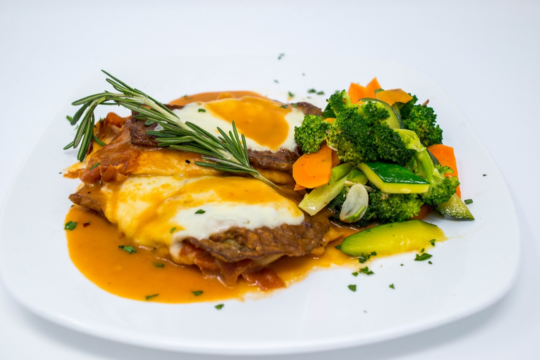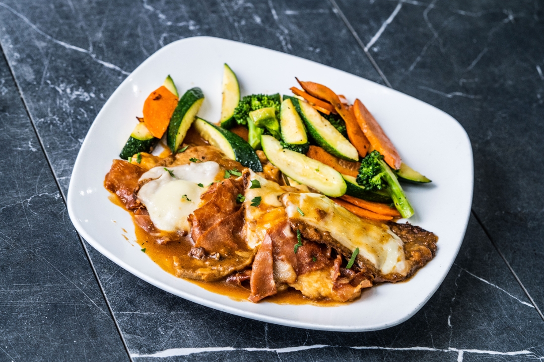 Chicken, prosciutto, eggplant, fresh mozzarella, a sherry wine sauce, and sautéed vegetables