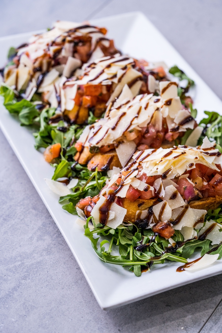 Breaded chicken, topped with bruschetta, shaved Parmesan cheese, and balsamic glaze, served over arugula.