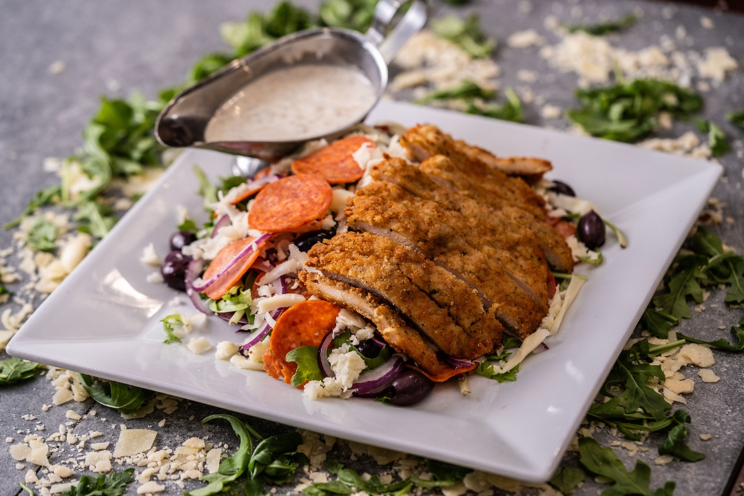 Mixed greens, breaded chicken, sliced pepperoni, olives, mozzarella, onions, and creamy Italian vinaigrette