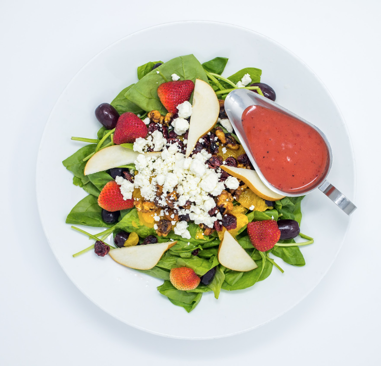 Baby spinach, grapes, cranberries, pears, strawberries, mandarin oranges, goat cheese, glazed walnuts, and raspberry vinaigrette