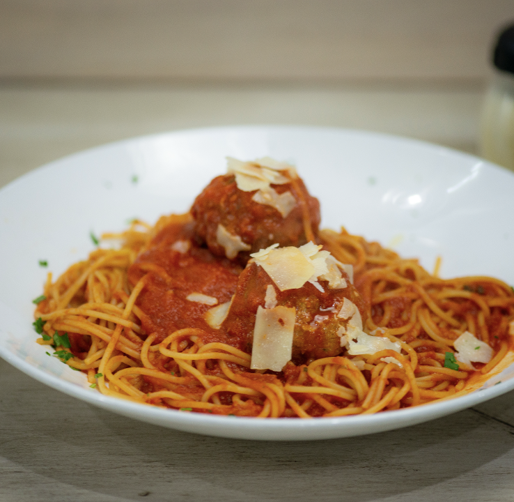 Spaghetti in tomato sauce with 2 homemade meatballs