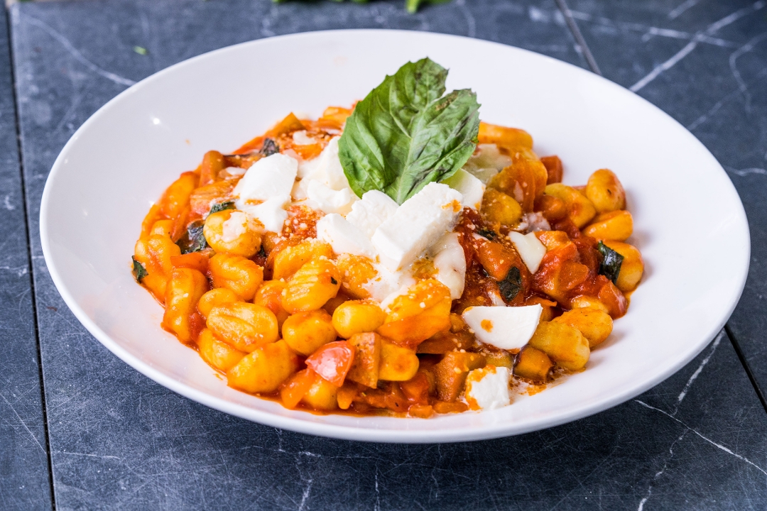Gnocchi, roasted eggplant, tomato sauce, and fresh mozzarella
