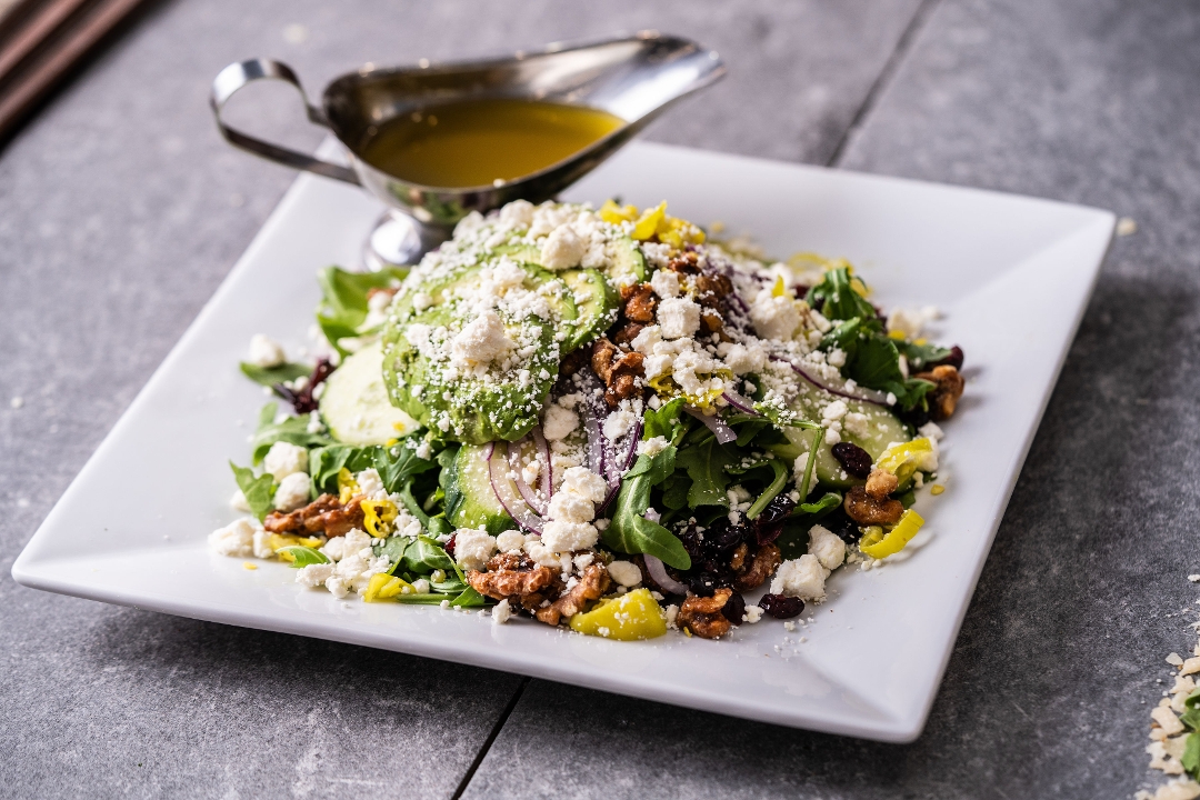 Arugula, cucumbers, peperoncini, avocado, cranberries, glazed walnuts, red onions, feta cheese, oil vinegar