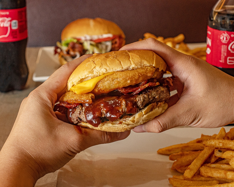 8 oz Certified Angus Beef burger with American cheese, fried onion ring, bacon and BBQ sauce
